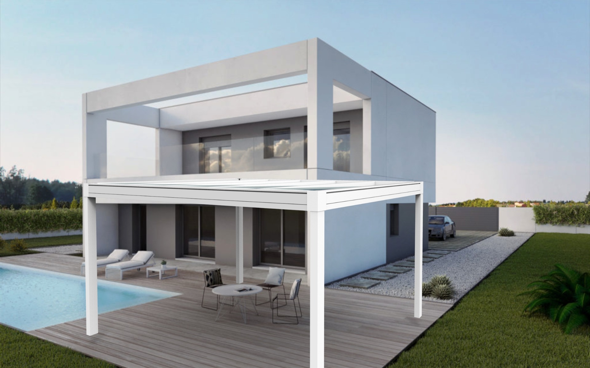A szerkezet modern, letisztult vonalú és tökéletesen illeszkedik bármilyen építészeti stílushoz. Elérhető lapos üvegtetővel vagy íves polikarbonát tetőszerkezettel.Az integrált esővízgyűjtő csatorna biztosítja a megfelelő vízelvezetést és kifolyást a szerkezet tartólábain.