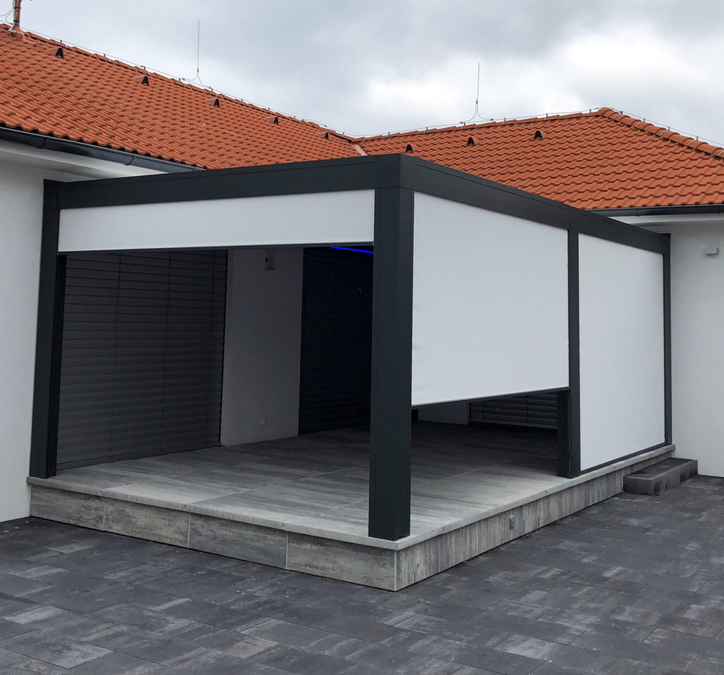 Motoros vezérlésű tartószerkezetbe integrált oldalsó alumínium lefutókkal és zip rendszerrel ellátott vertikális árnyékoló. Ez az innovatív technológia biztosítja a kiemelkedő szélállóságot, ugyanis a textil extrém időjárási körülmények között is a helyén marad, nem zörög, nem szakad.